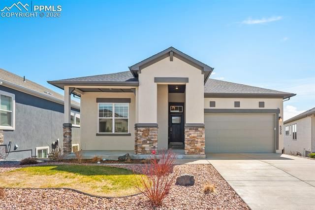 Welcome to your dream home in the highly desirable Wolf Ranch community, located within award-winning District 20 schools. This highly customized David Weekley Homes “Lanewood” plan showcases exceptional craftsmanship, thoughtful design, and elevated finishes throughout. At the heart of the home is a chef’s kitchen featuring an oversized quartz island, tall white cabinetry, induction cooktop, built-in GE Café double wall ovens, microwave, and premium finishes designed for both everyday living and entertaining. Additional upgrades include a central vacuum system, tankless water heater, and electric vehicle charging in the garage. The main level offers true ease of living with a spacious Owner’s Retreat, two secondary bedrooms, and a private study with French doors. The open-concept layout is enhanced by 10’ ceilings, abundant natural light, and a stunning natural stone fireplace that anchors the living space. Just off the main living area, a large covered deck with mountain views provides the perfect setting to enjoy your morning coffee or unwind in the evening. The fully finished walk-out basement with 9’ ceilings is an entertainer’s dream, complete with a large entertainment room with a built-in surround sound system. You’ll also find a fourth bedroom with an ensuite bath and two walk-in closets, a fifth bedroom, an additional full bathroom, and a secondary washer/dryer hookup, ideal for guests or multi-generational living. Step outside the walkout basement to a fully landscaped backyard with stunning views of Pikes Peak. Custom touches throughout include herringbone tile in the kitchen and primary bath, Roman shades, and electric shades on the basement sliding doors. Two wall-mounted TVs (primary suite and basement) are included. Enjoy all that Wolf Ranch has to offer, including outdoor concerts, food trucks in the park, a community rec center and pool, Woof Ranch dog park, and over 10 miles of scenic walking trails.